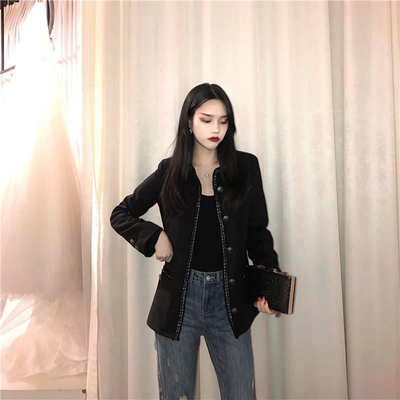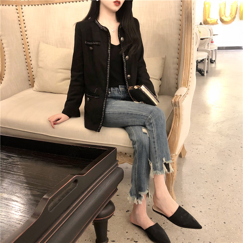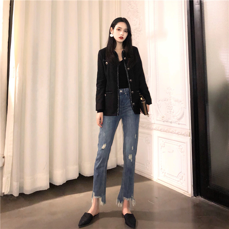 韓國復古時尚氣質修身短款呢子外套+高腰加厚不規則毛邊牛仔褲女