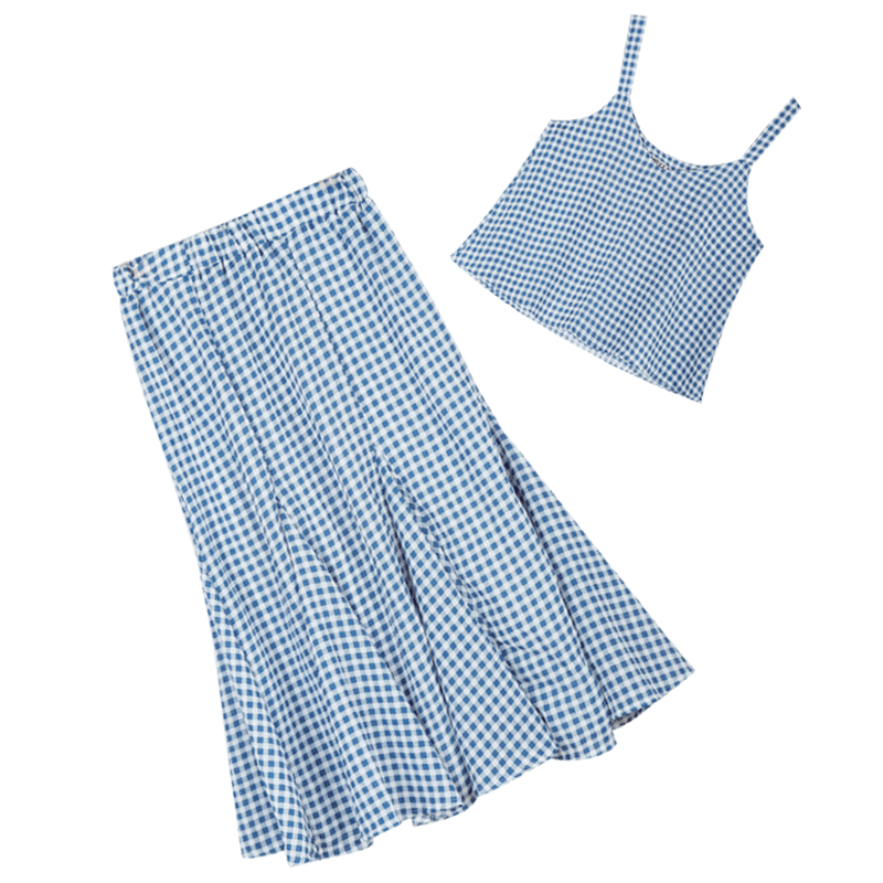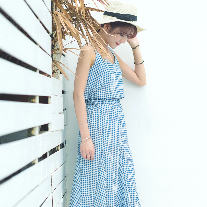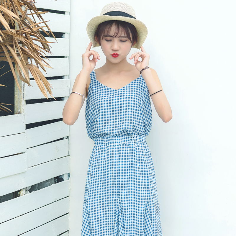/ 夏裝新款韓版女裝顯瘦藍色格子連衣裙中長款吊帶學院風裙子潮