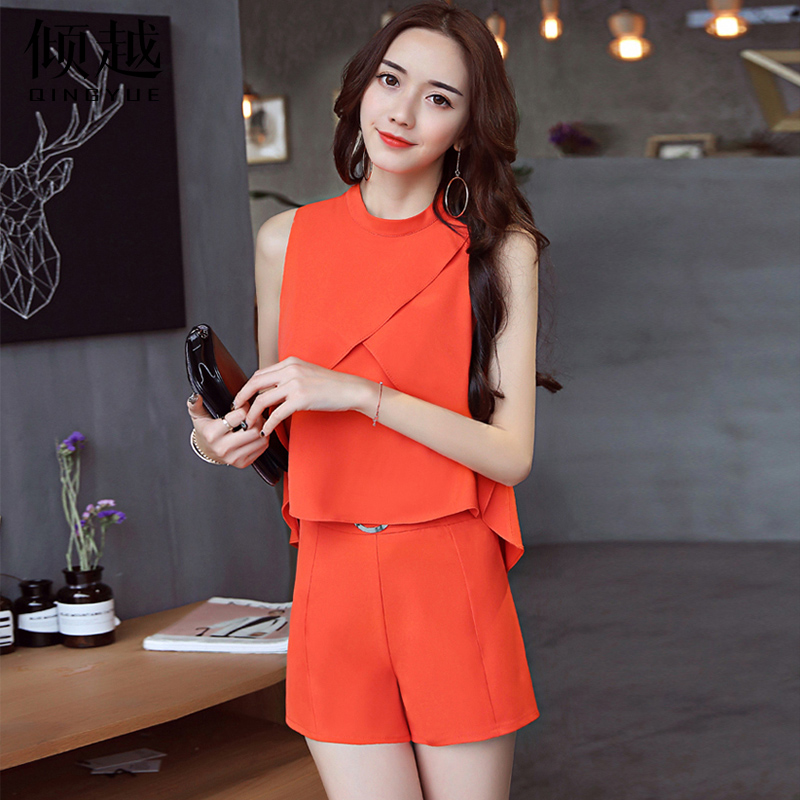 傾越夏季套裝女時尚兩件套2017新款韓版寬松雪紡上衣休閑短褲套裝