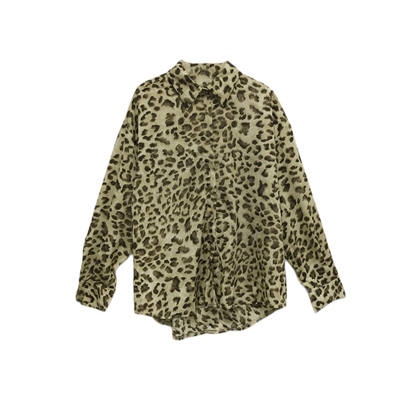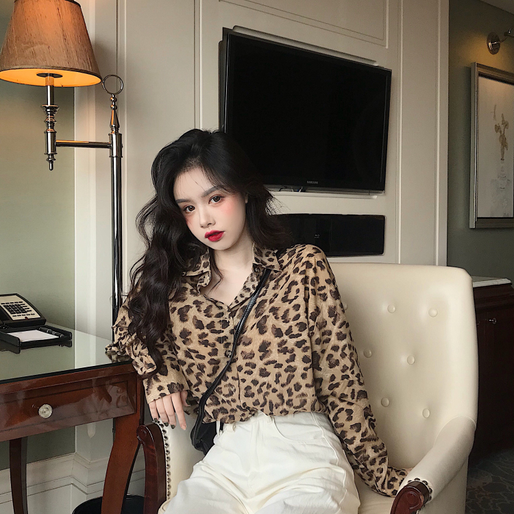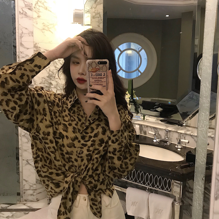 時尚chic早秋上衣港味長袖襯衣女2018新款豹紋韓范百搭v領襯衫潮