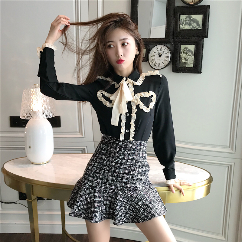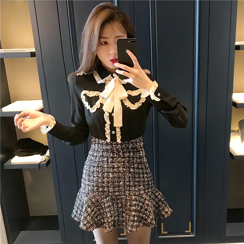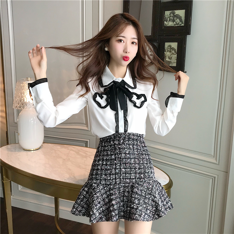 秋季套裝女時尚兩件套2018新款小香風雪紡襯衫魚尾半身裙休閑學生