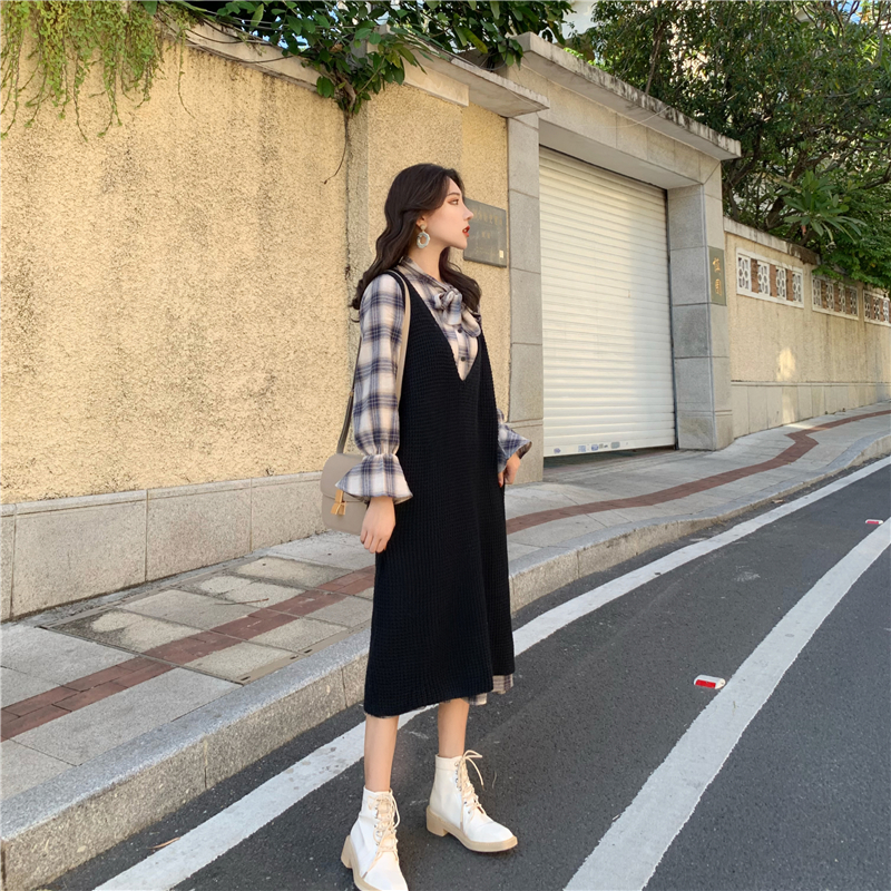 溫柔復古chic打底長襯衫裙時尚套裝高冷氣質復古針織馬甲兩件套女