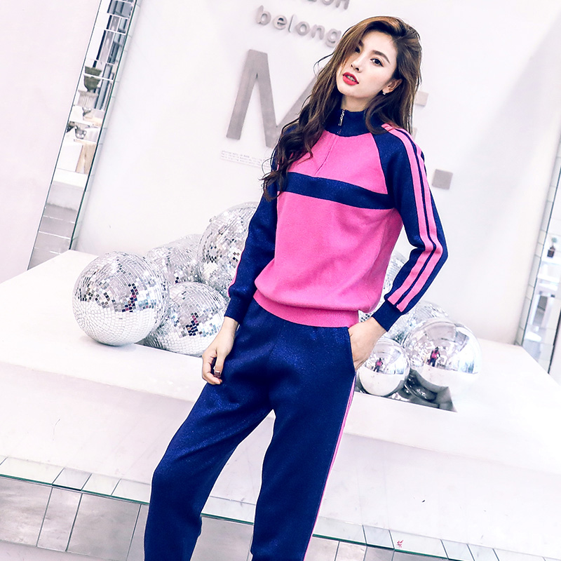 運動套裝女士秋裝2018新款寬松休閑秋冬撞色針織運動服時尚兩件套