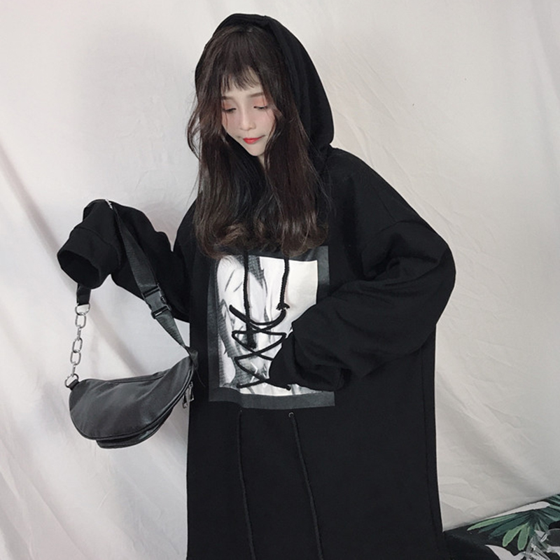 原宿風中長印花連帽衛衣秋裝女2018新款韓版學生寬松長袖上衣外套