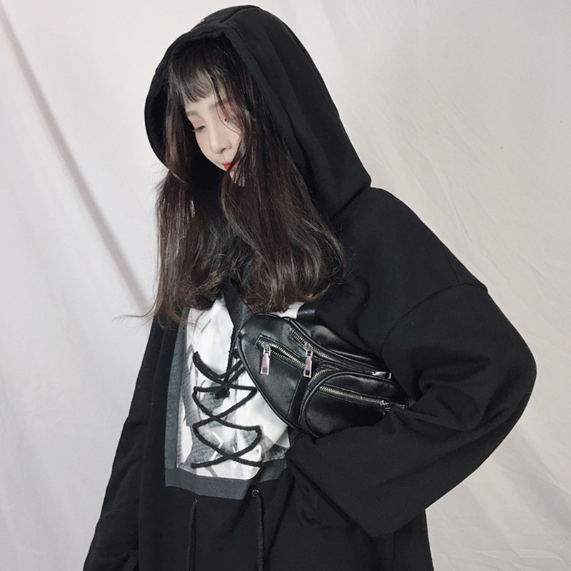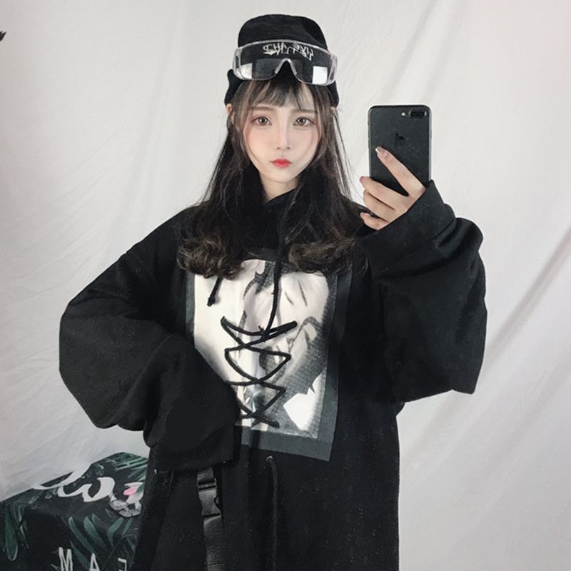 / 原宿風中長印花連帽衛衣秋裝女2018新款韓版學生寬松長袖上衣外套