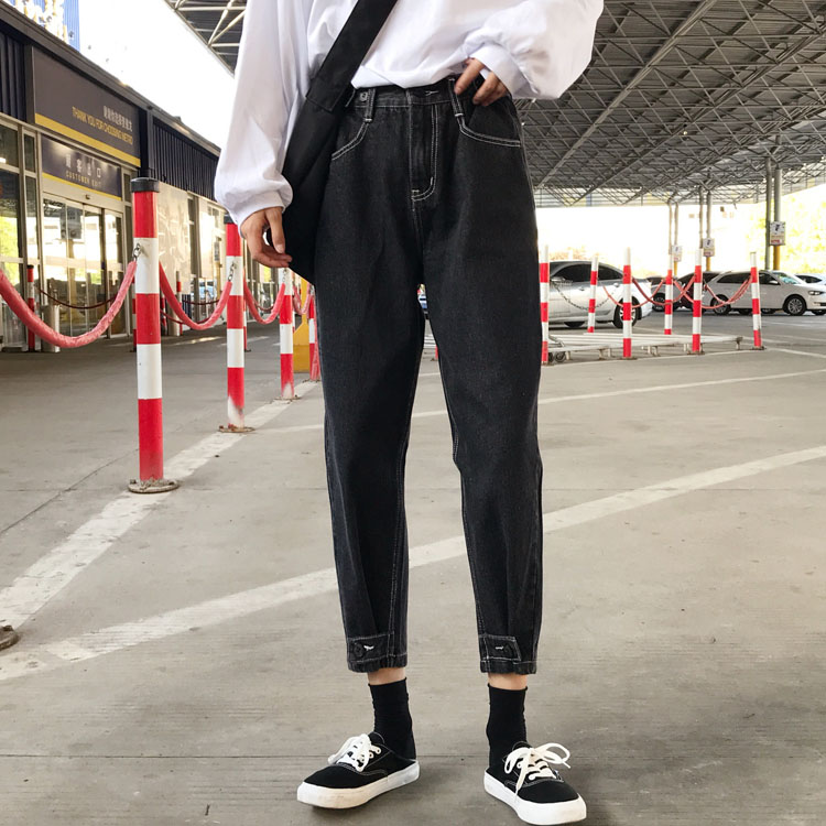/ 秋裝女裝韓版復古褲腳紐扣牛仔褲寬松高腰顯瘦直筒褲哈倫褲九分褲