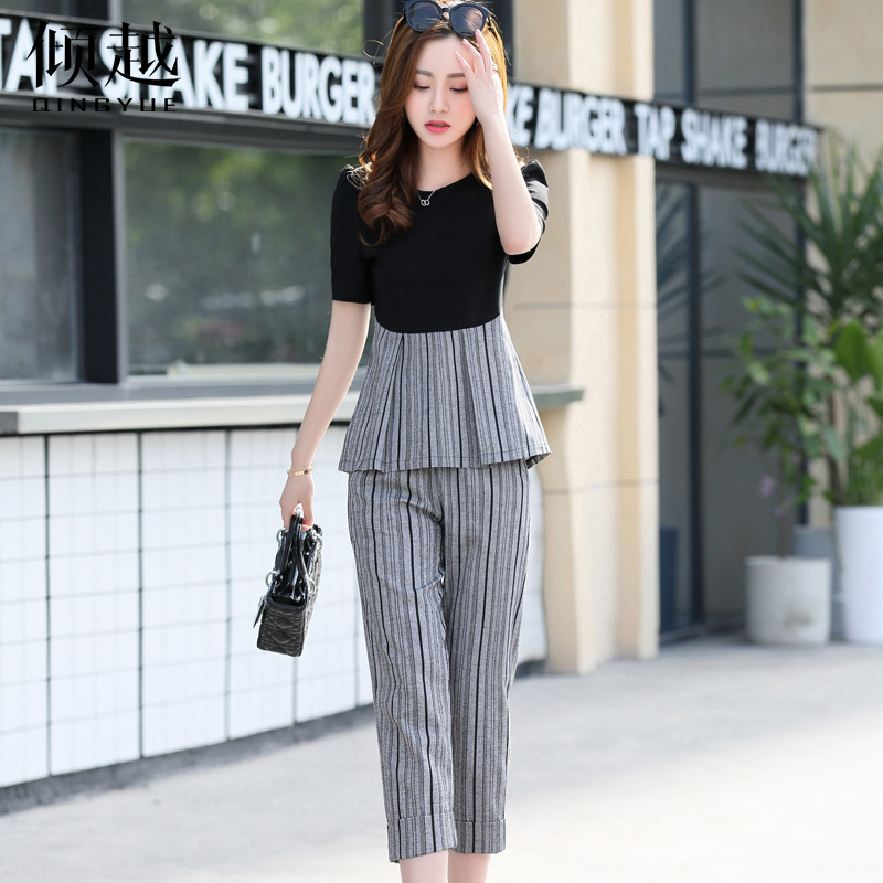 傾越套裝2017年夏季新款條紋拼接短袖上衣九分褲子收腰修身兩件套