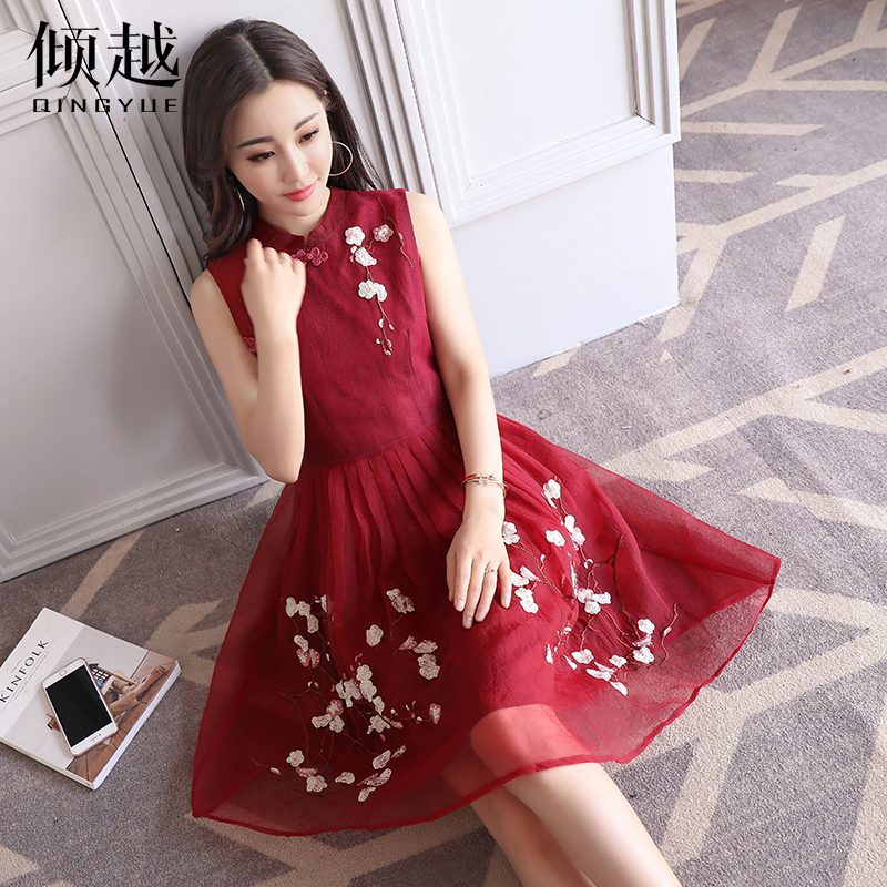 2017夏裝韓版新款女裝修身氣質歐根紗刺繡復古中長款無袖連衣裙潮