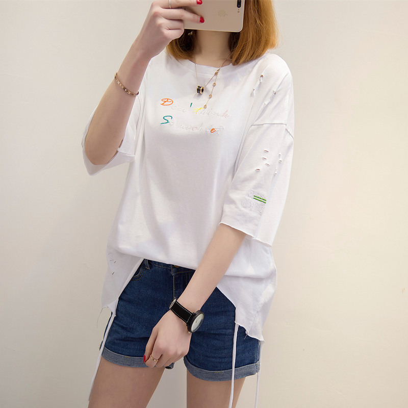 / 短袖上衣女夏新款寬松白色t恤女流蘇韓版破洞體恤衫打底百搭