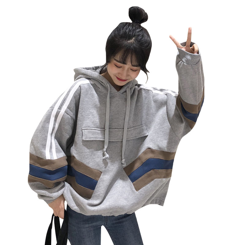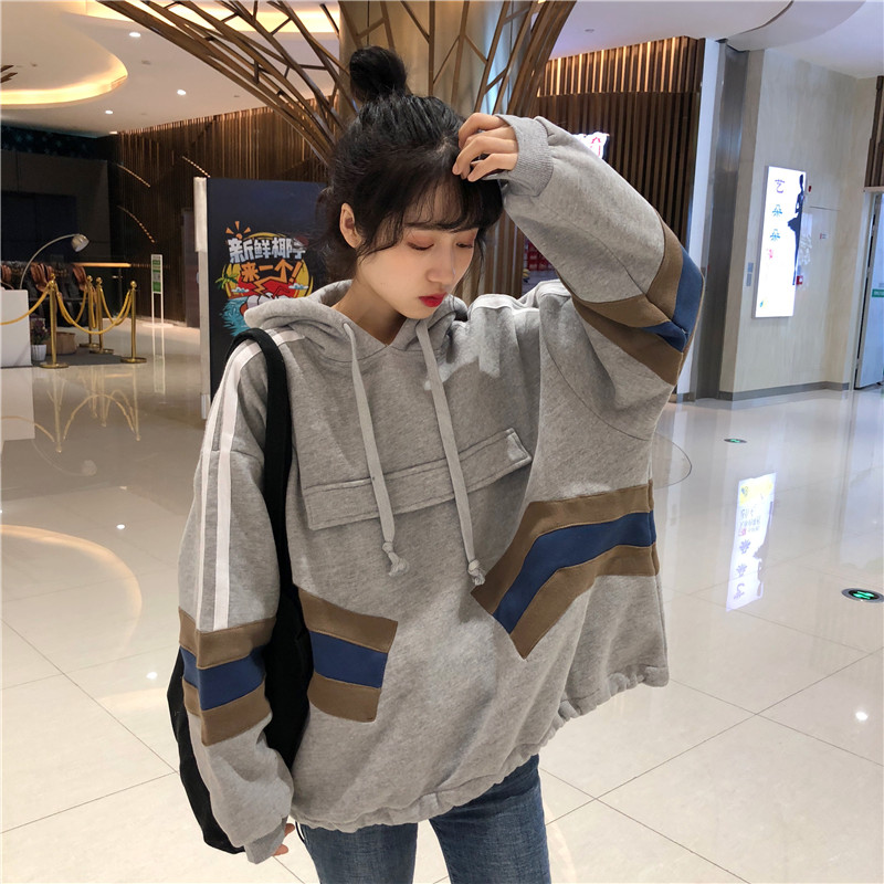 / 秋冬韓版寬松撞色拼接連帽慵懶風加絨加厚套頭超火衛衣上衣外套女