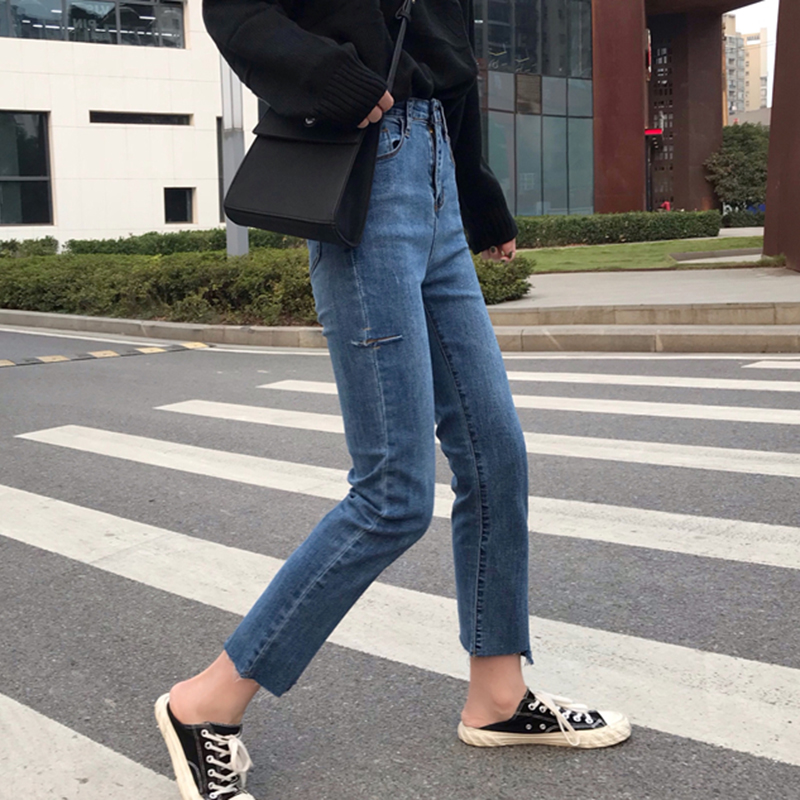 / 秋冬女裝2018新款高腰不規則撕邊怪味牛仔褲破洞九分直筒休閑褲子