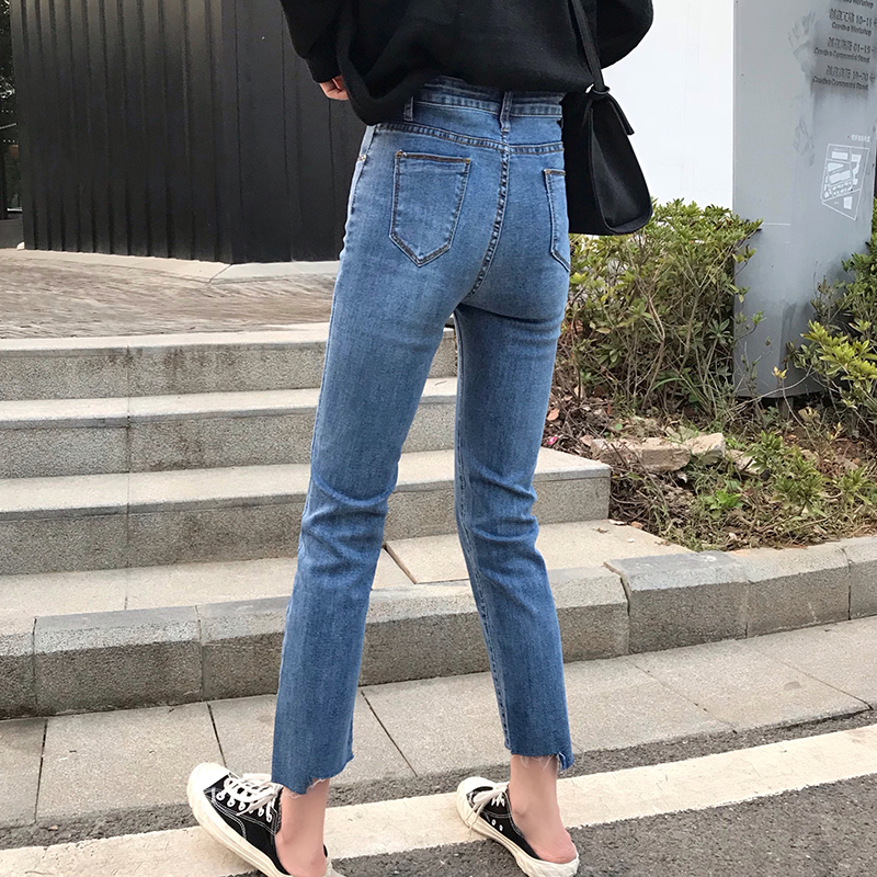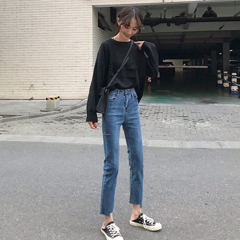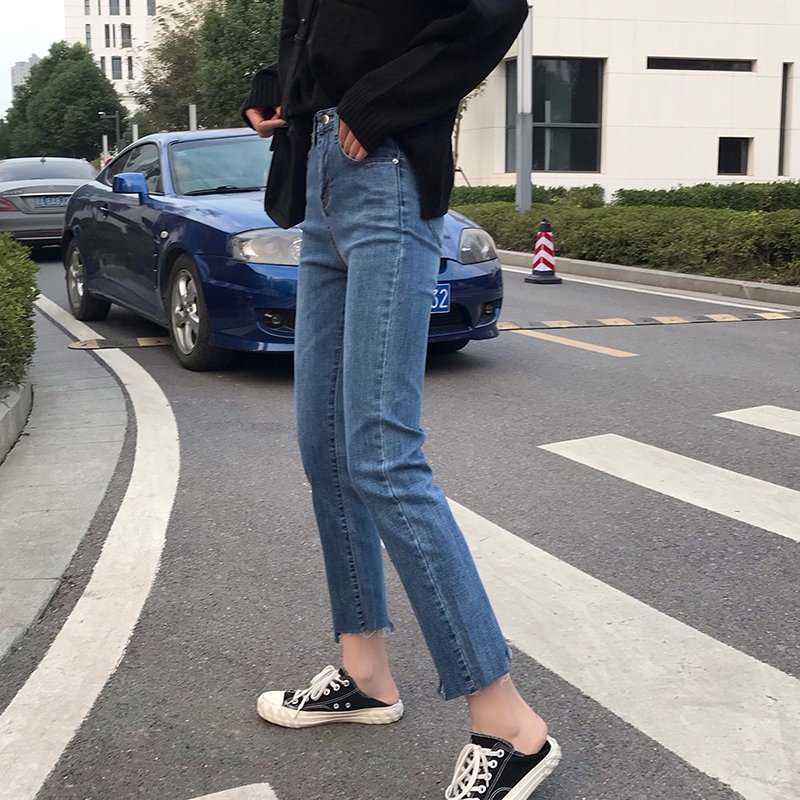 秋冬女裝2018新款高腰不規則撕邊怪味牛仔褲破洞九分直筒休閑褲子
