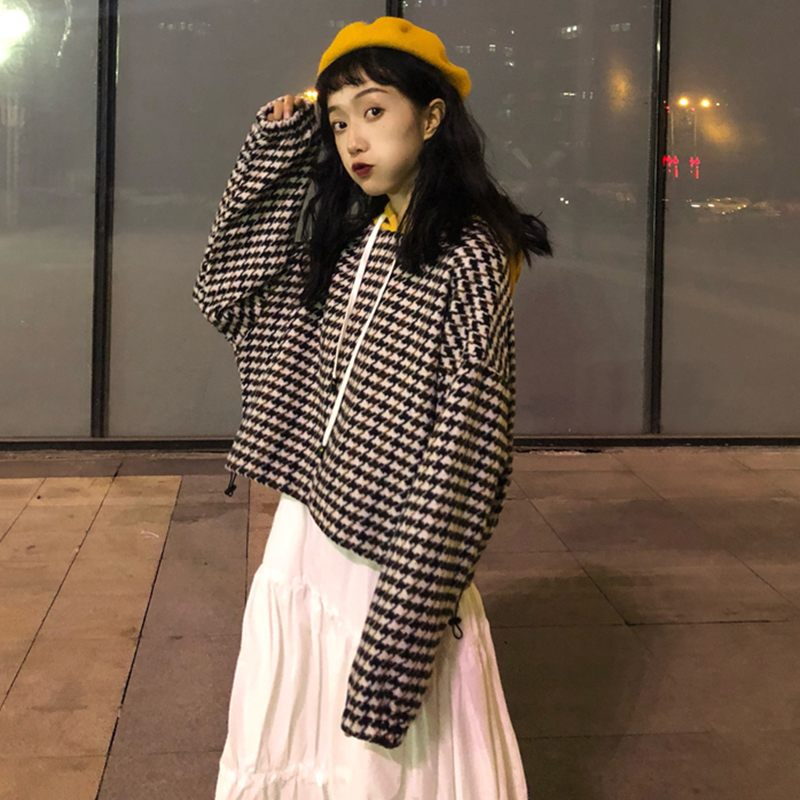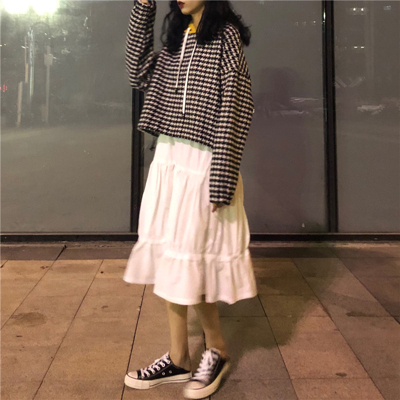 洋氣套裝女秋冬2018新款格子拼接連帽衛衣中長款高腰A字半身裙子