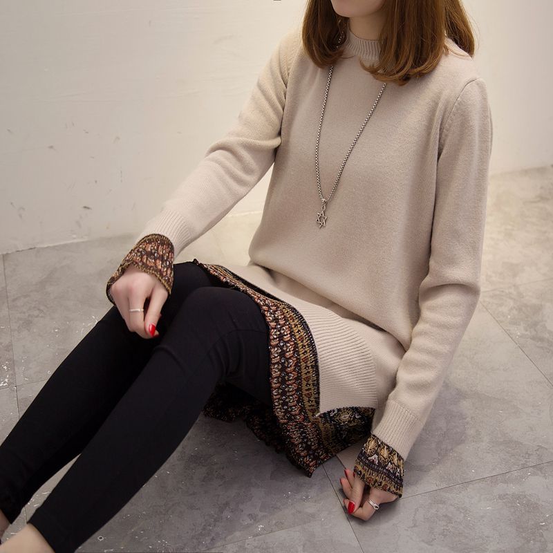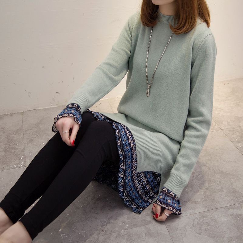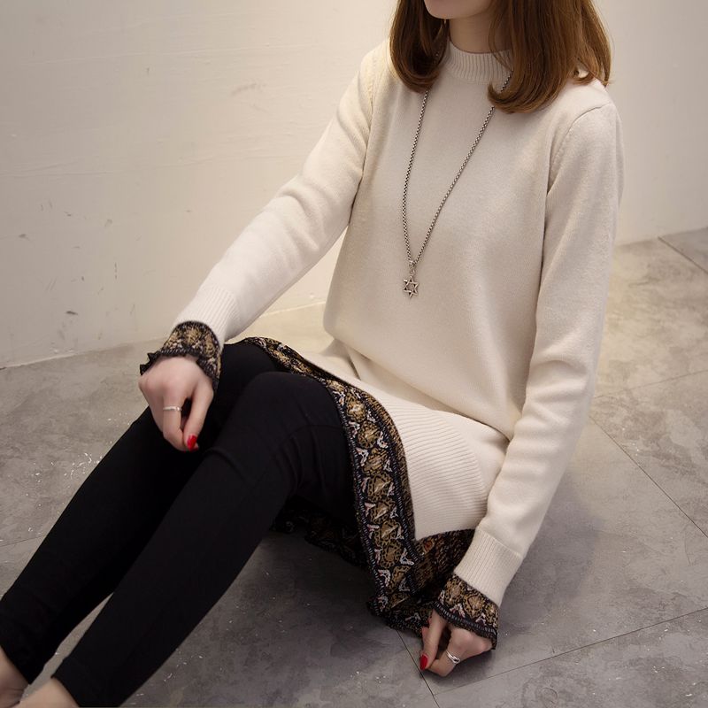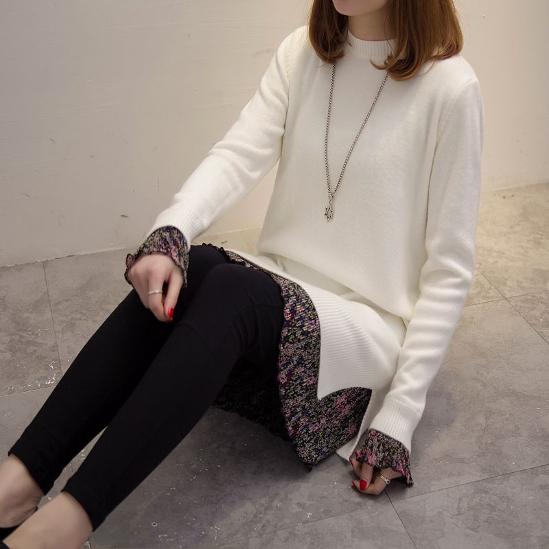 / 假兩件套頭針織衫中長款新款潮冬季女裝外套上衣寬松純色毛衣