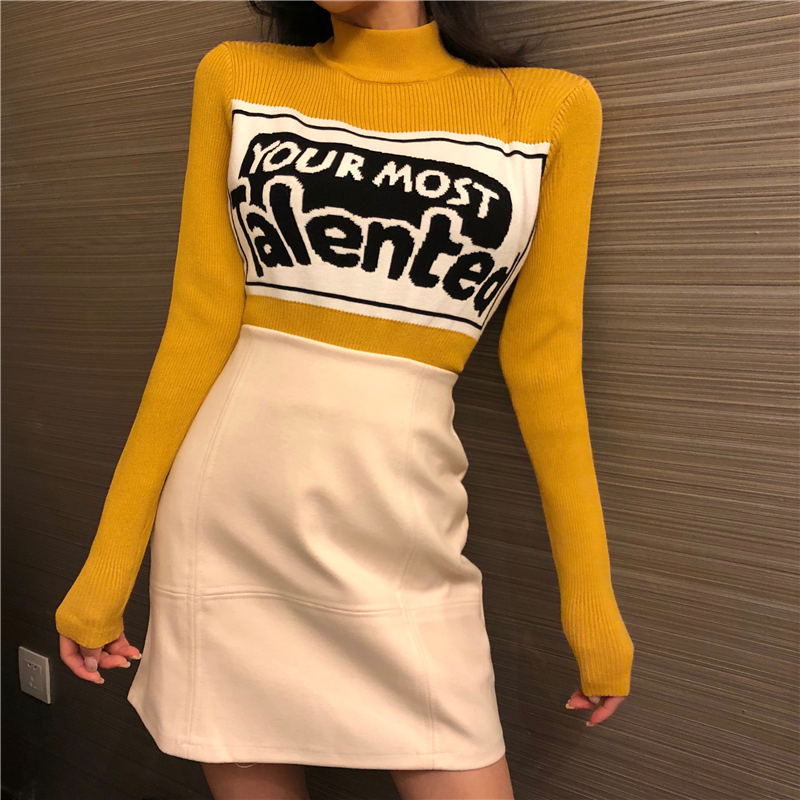 / 港味秋冬新款時尚字母拼接針織衫毛衣chic兩件套包臀顯瘦短裙套裝