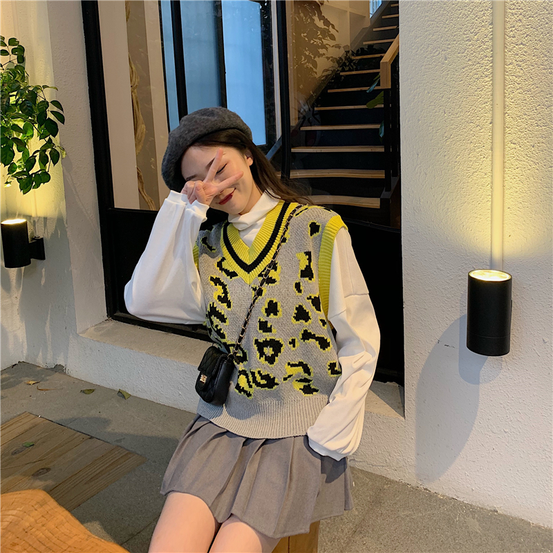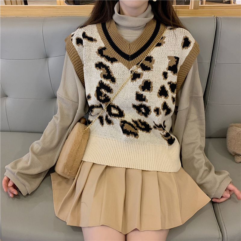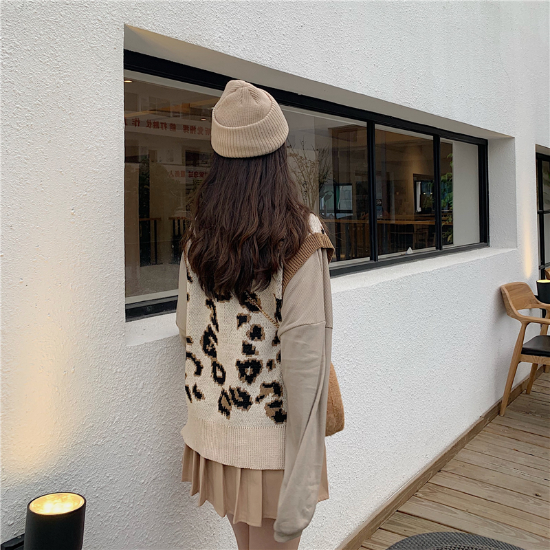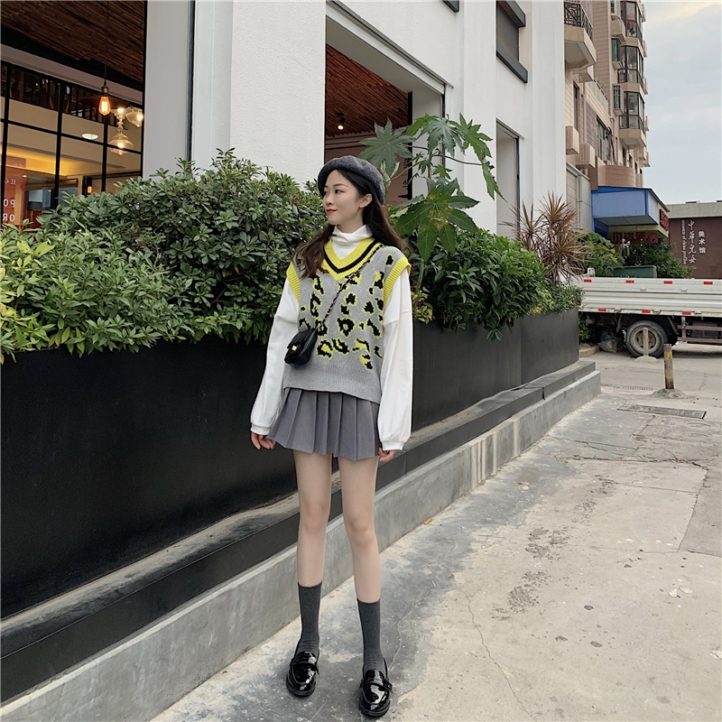 / 韓版時尚寬松百搭豹紋V領套頭毛衣馬甲+高腰毛呢百褶短裙兩件套