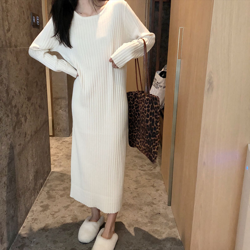/ 韓版圓領螺紋長袖中長款針織毛衣女秋冬2018新款套頭打底連衣裙女