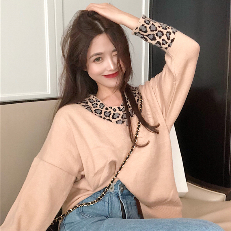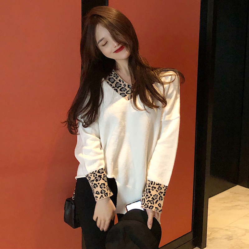 / 秋冬女裝2018新款豹紋假兩件毛衣不規則拼接V領針織衫時尚外套潮