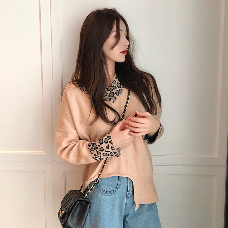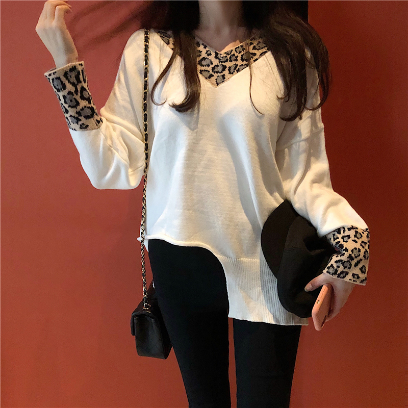 秋冬女裝2018新款豹紋假兩件毛衣不規則拼接V領針織衫時尚外套潮