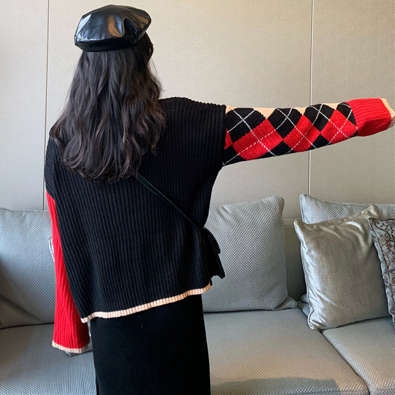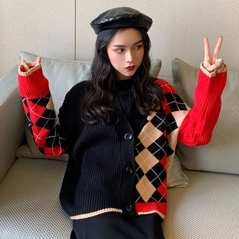 V領格子慵懶針織開衫女秋冬裝新款寬松長袖毛衣外套學生時尚上衣
