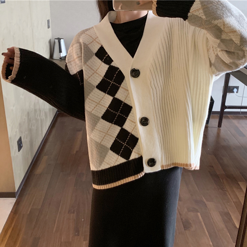 / V領格子慵懶針織開衫女秋冬裝新款寬松長袖毛衣外套學生時尚上衣