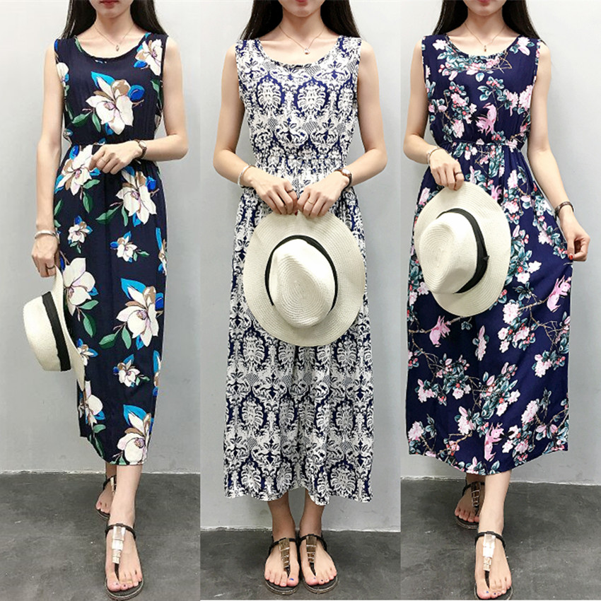 / 波西米亞綿綢連衣裙長款女棉綢夏季碎花無袖渡假沙灘人造棉長裙