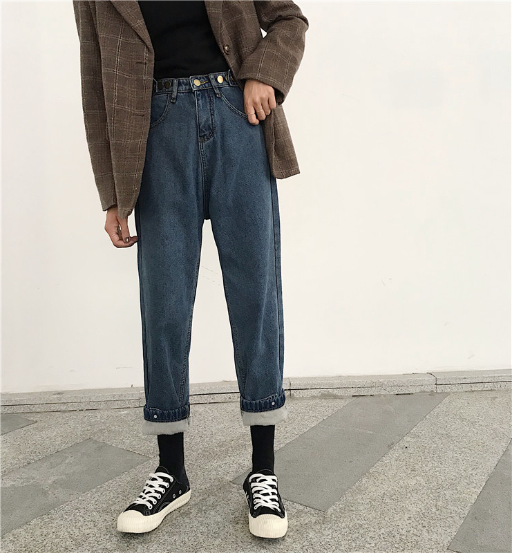/ 褲子2018新款冬季加絨加厚寬松直筒闊腿哈倫老爹蘿卜褲牛仔褲女潮