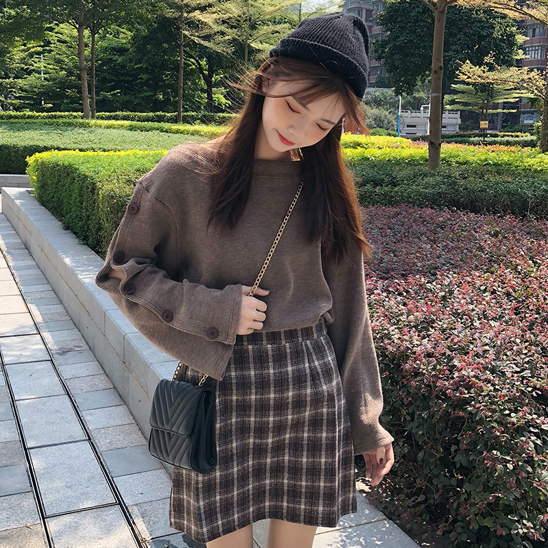 / 韓版時尚休閑套裝秋季女裝排扣針織衫衛衣+格子呢子半身裙兩件套