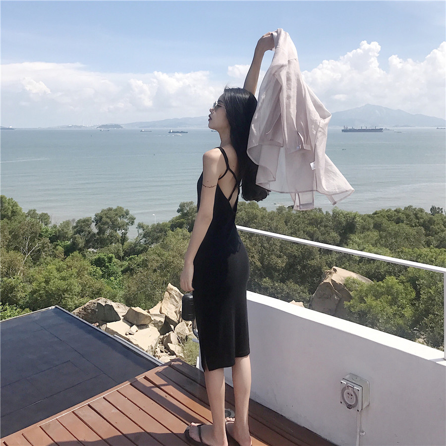 / 春秋裝2018新款復古chic風性感露背吊帶中長款顯瘦氣質修身連衣裙