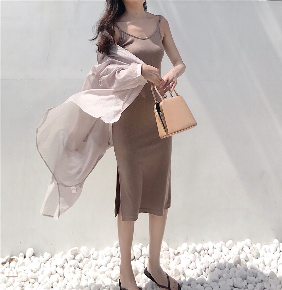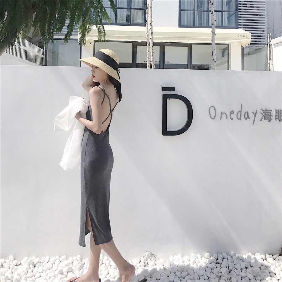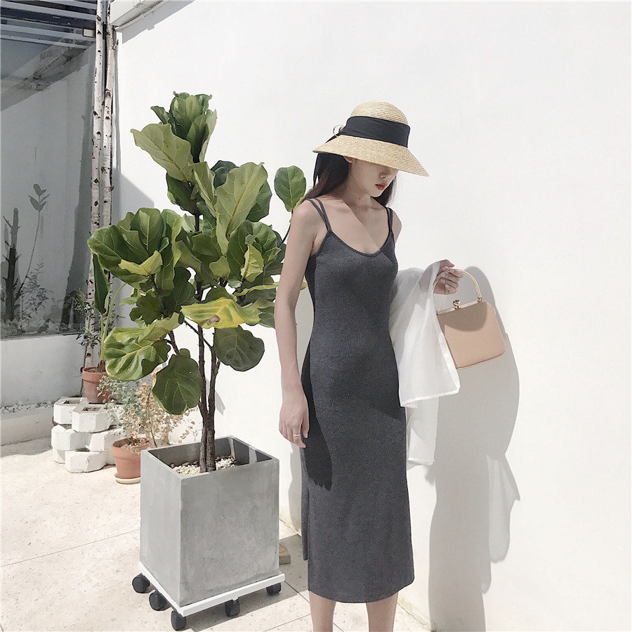 好看的三色針織露背吊帶裙