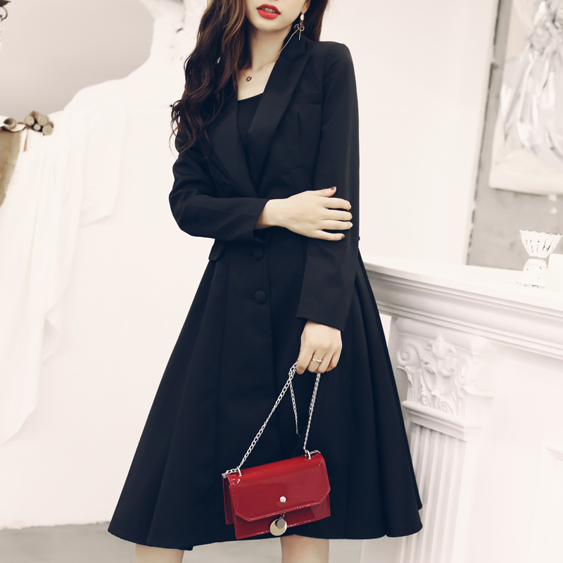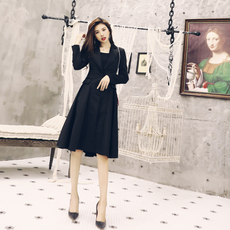 / 2018新款春秋風衣女中長款過膝韓版大擺連衣裙黑色chic大衣秋外套