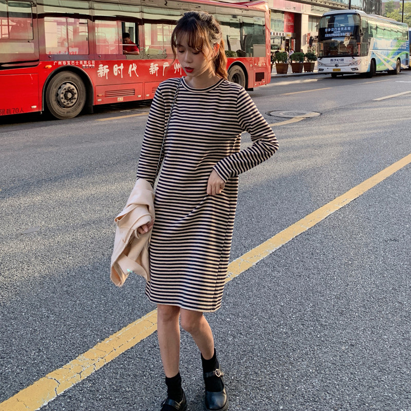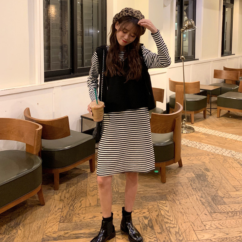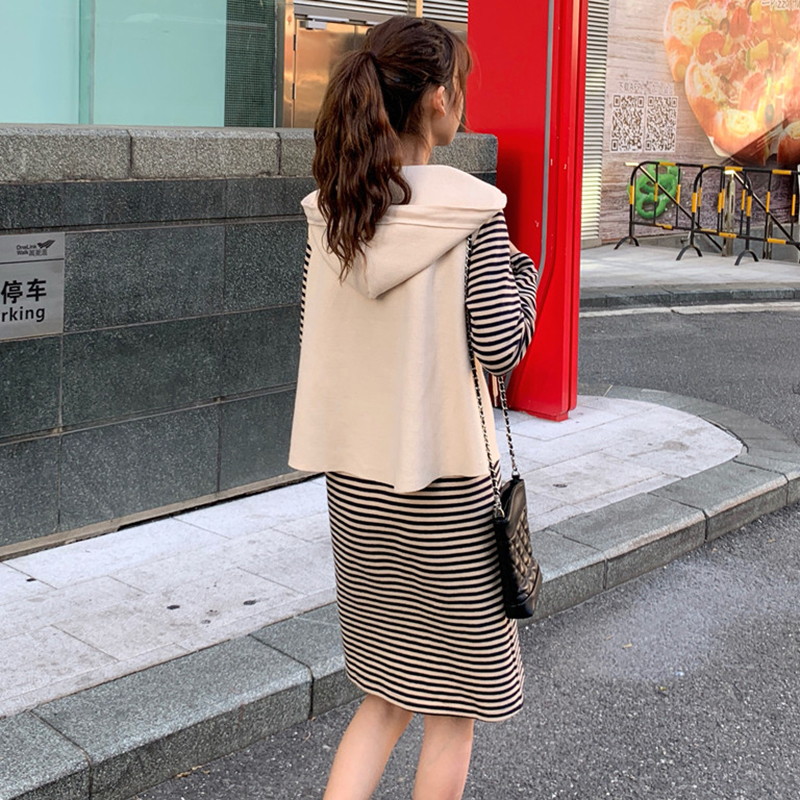 / 氣質女神兩件套秋冬新款韓版百搭連帽短外套寬松顯瘦條紋連衣裙子