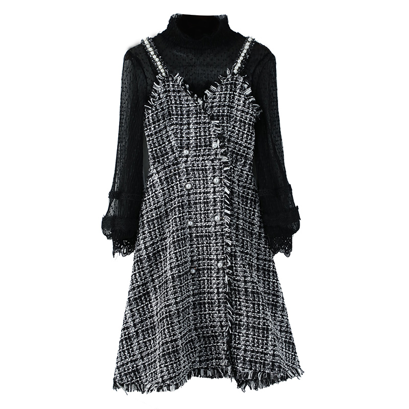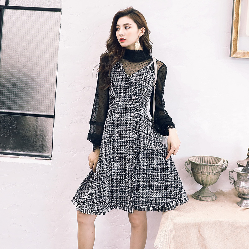 秋裝女2018新款毛呢網紅背帶連衣裙兩件套俏皮透視打底衫女神套裝