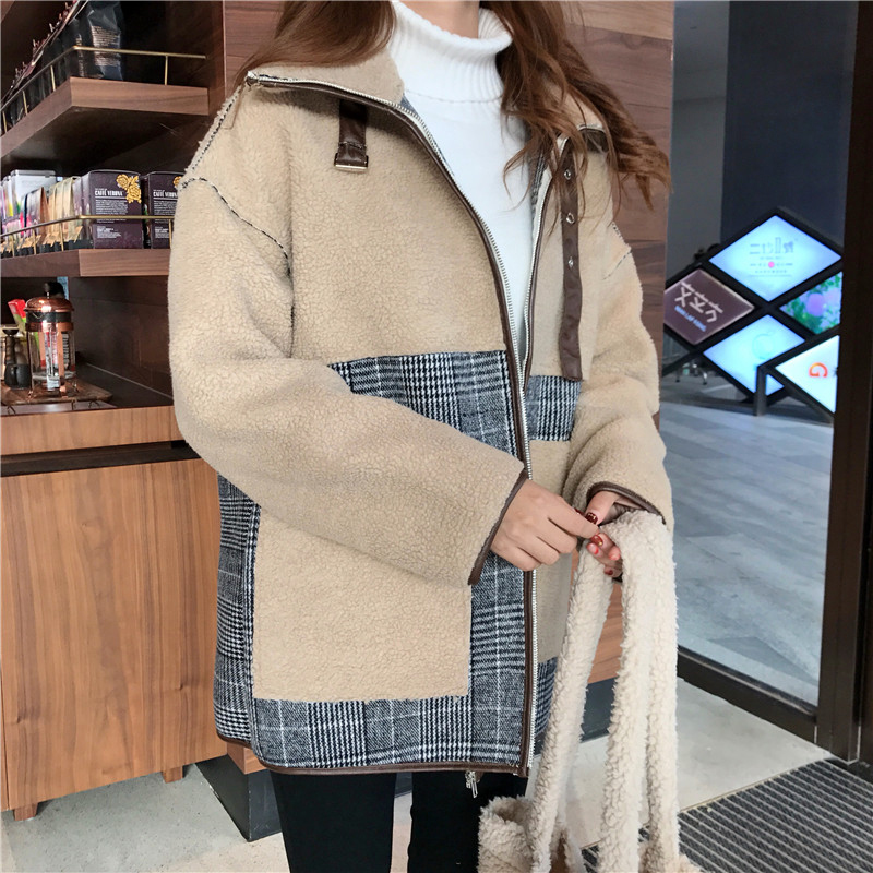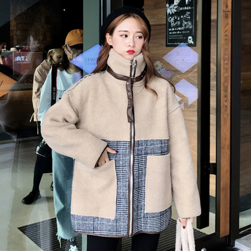 秋冬女裝2018新款韓版格子拼接羊羔毛外套學生寬松立領毛呢開衫潮