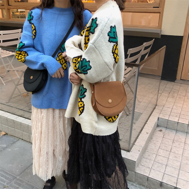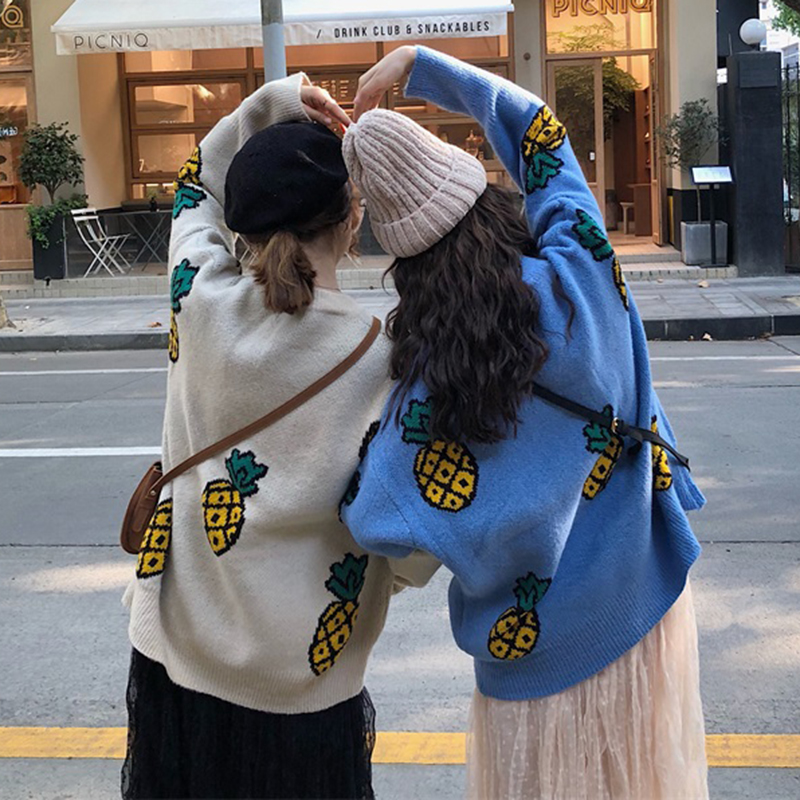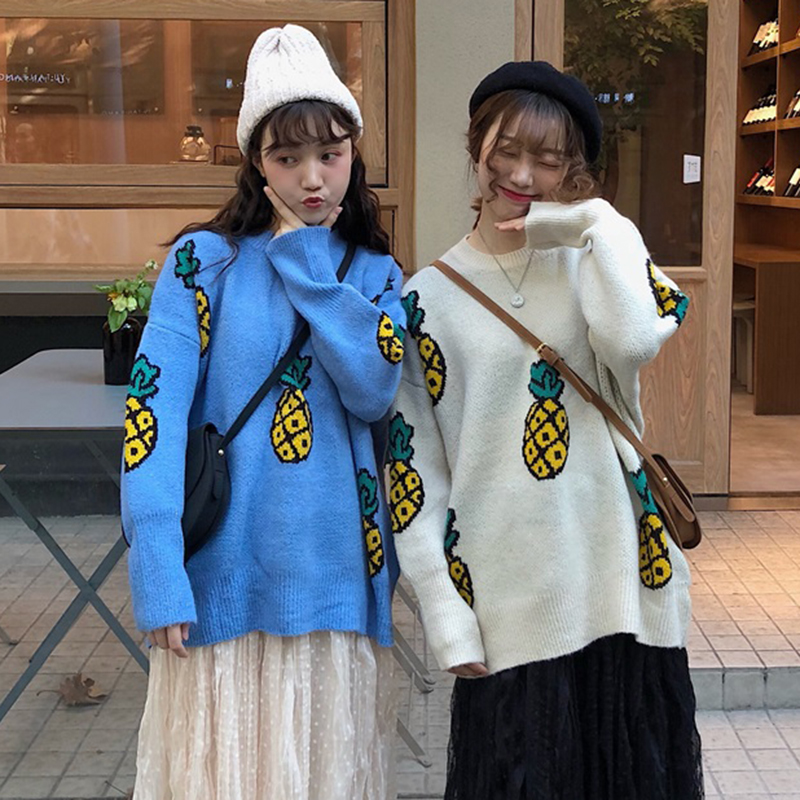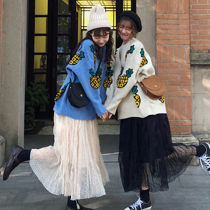 / 洋氣套裝女秋冬新款菠蘿寬松套頭毛衣中長款高腰網紗百褶半身裙子