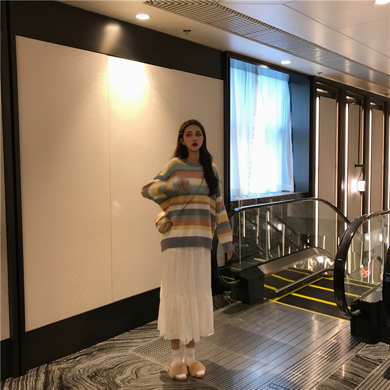 / 復古甜美軟糯不起球彩虹毛衣+小清新雪紡高腰半身裙套裝兩件套潮