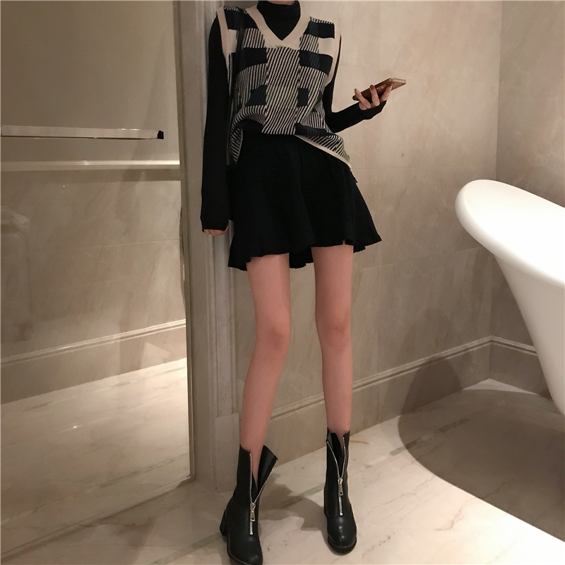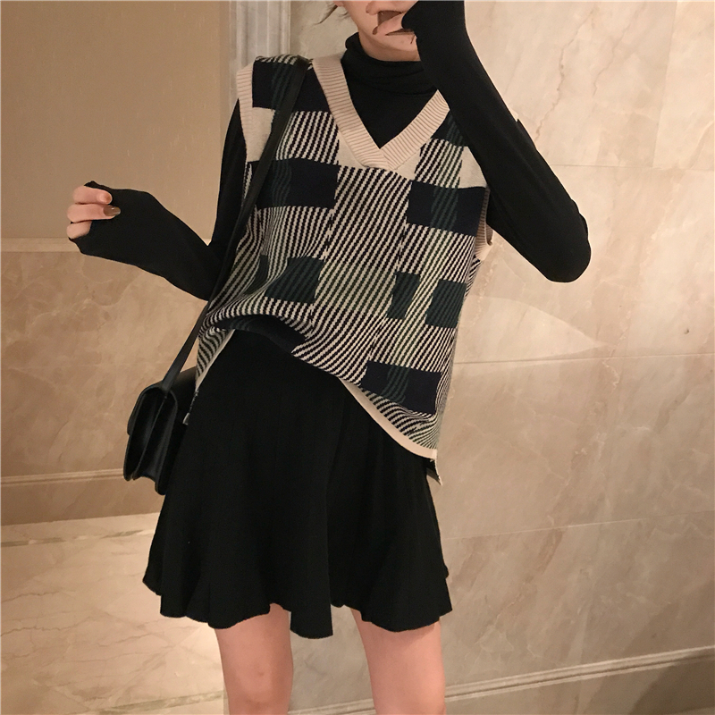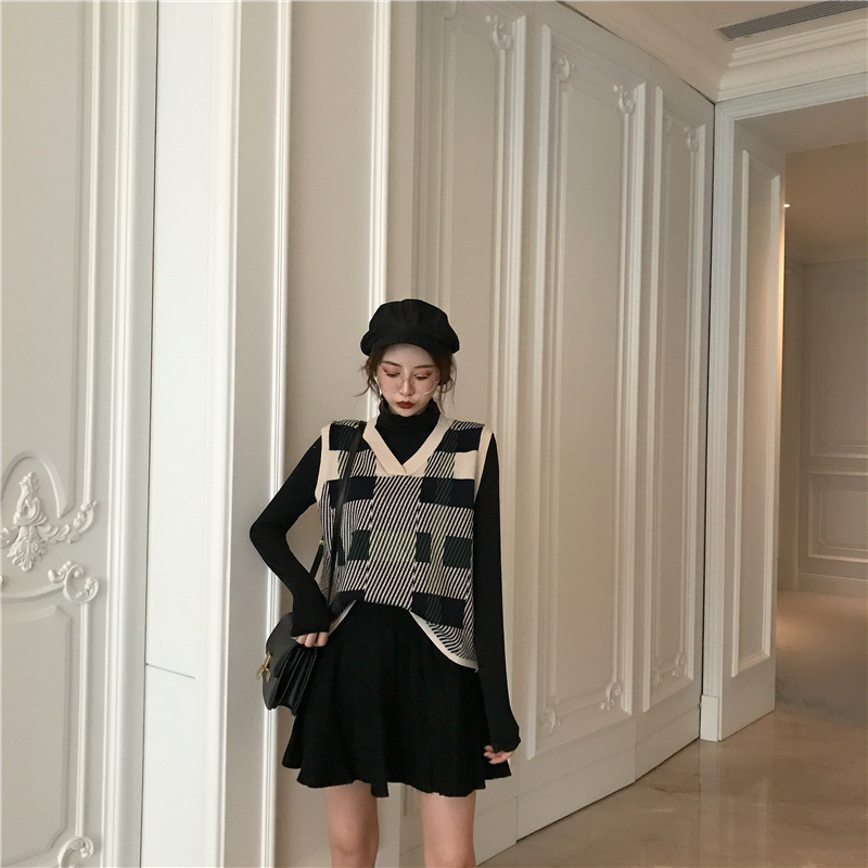 / 網紅同款包芯紗針織格子馬甲女秋冬2018新款女+百搭針織傘裙套裝