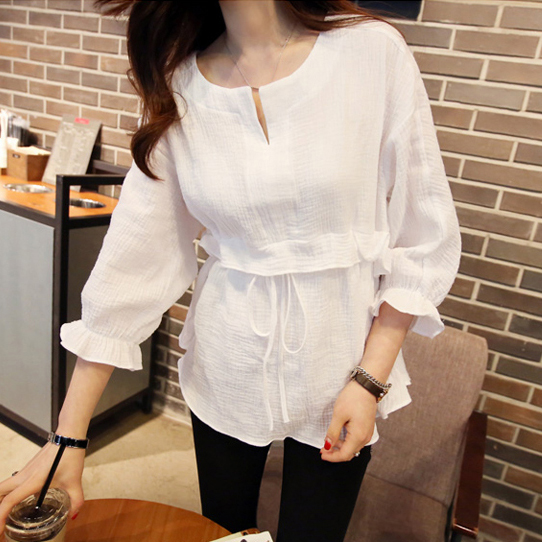 夏天女裝t恤寬松棉麻收腰系帶上衣小清新V領娃娃衫2017春款襯衣女