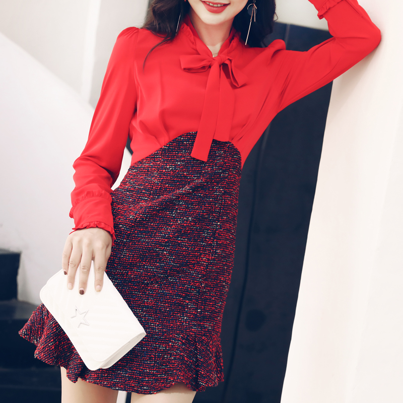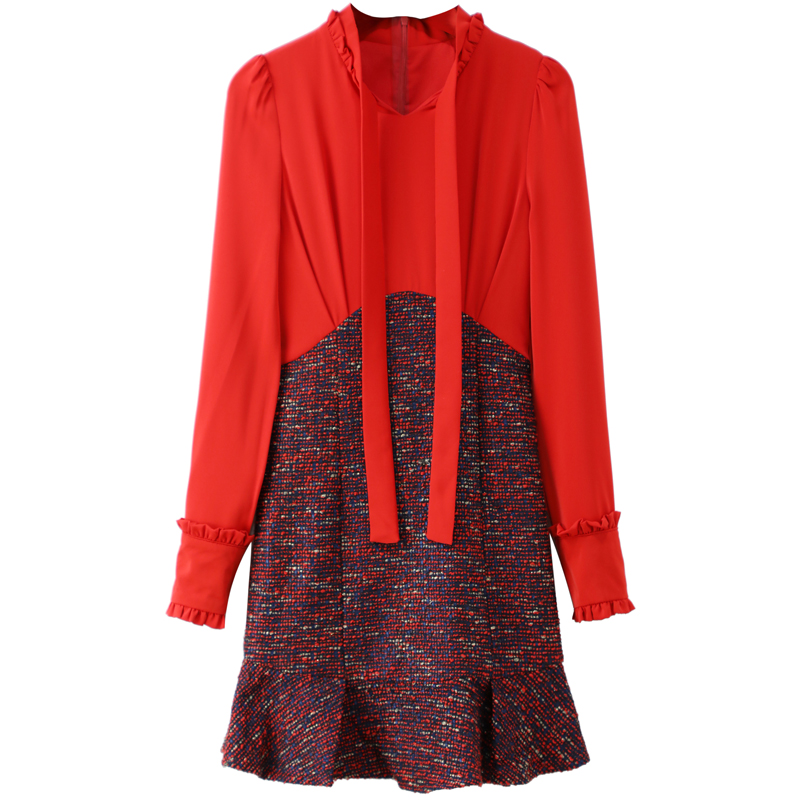 / 連衣裙女2018秋冬新款長袖包臀a字裙港味初戀復古魚尾拼接打底裙