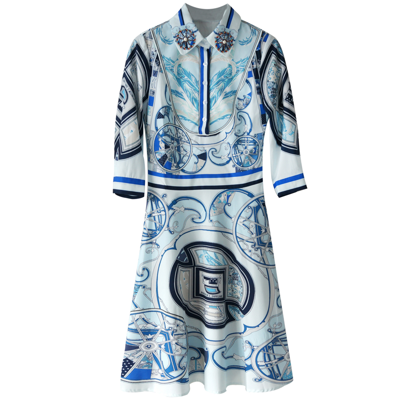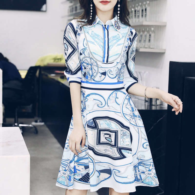 s秀名媛氣質2018夏季新款釘珠短袖印花收腰顯瘦女神范連衣裙潮