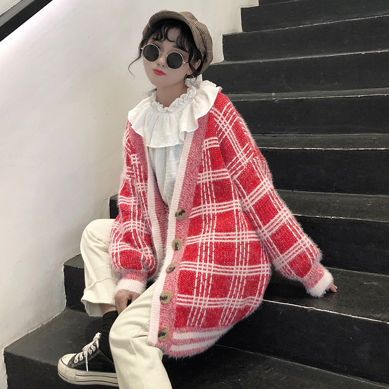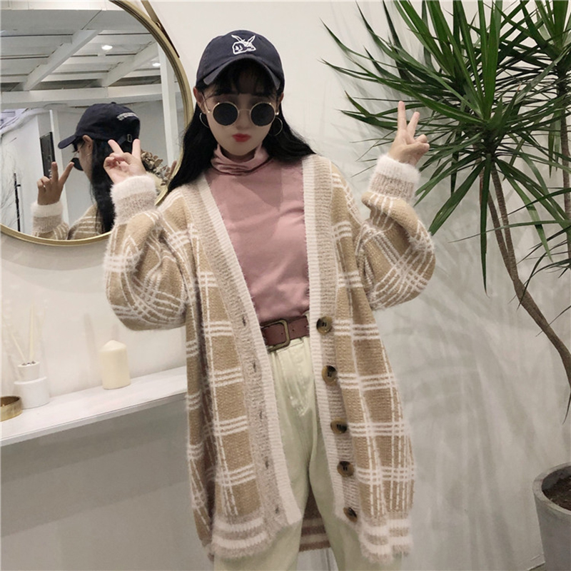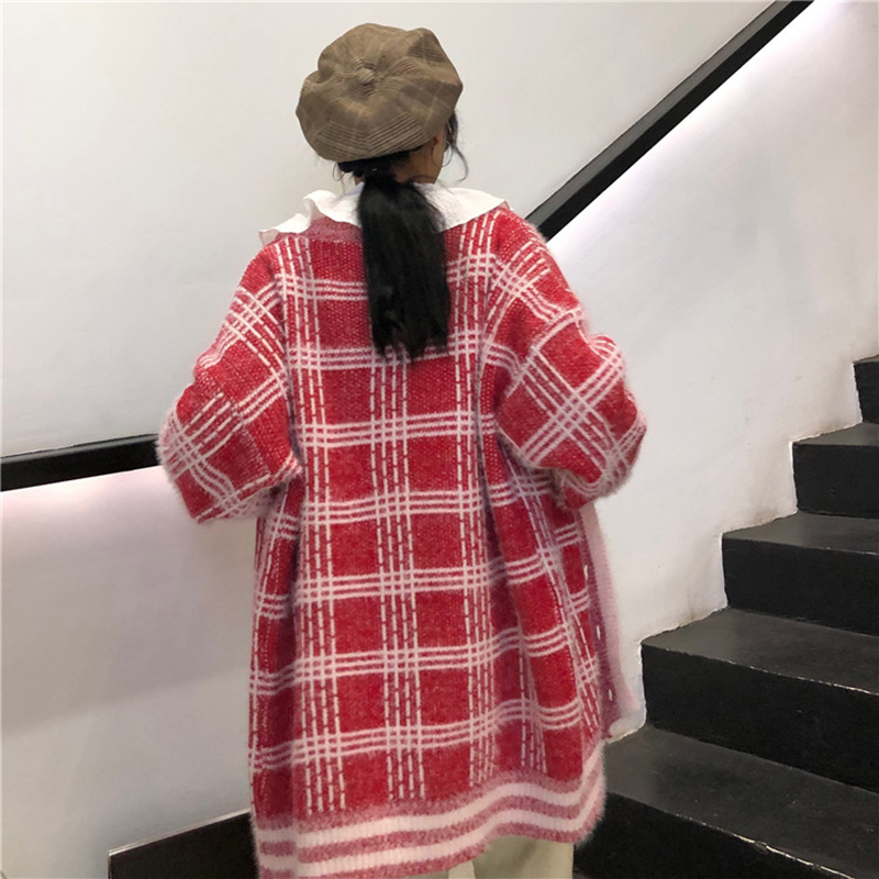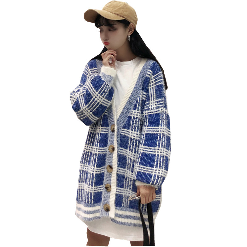 / 秋裝女2018新款韓版寬松格子開衫毛衣外套中長款V領長袖針織上衣