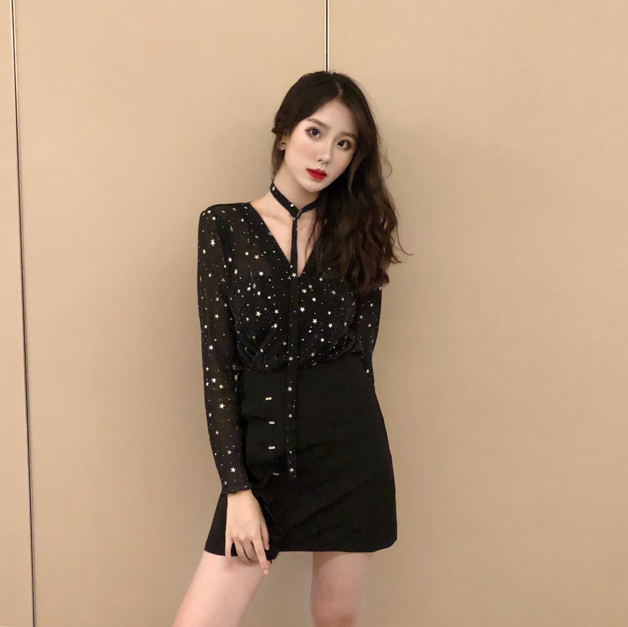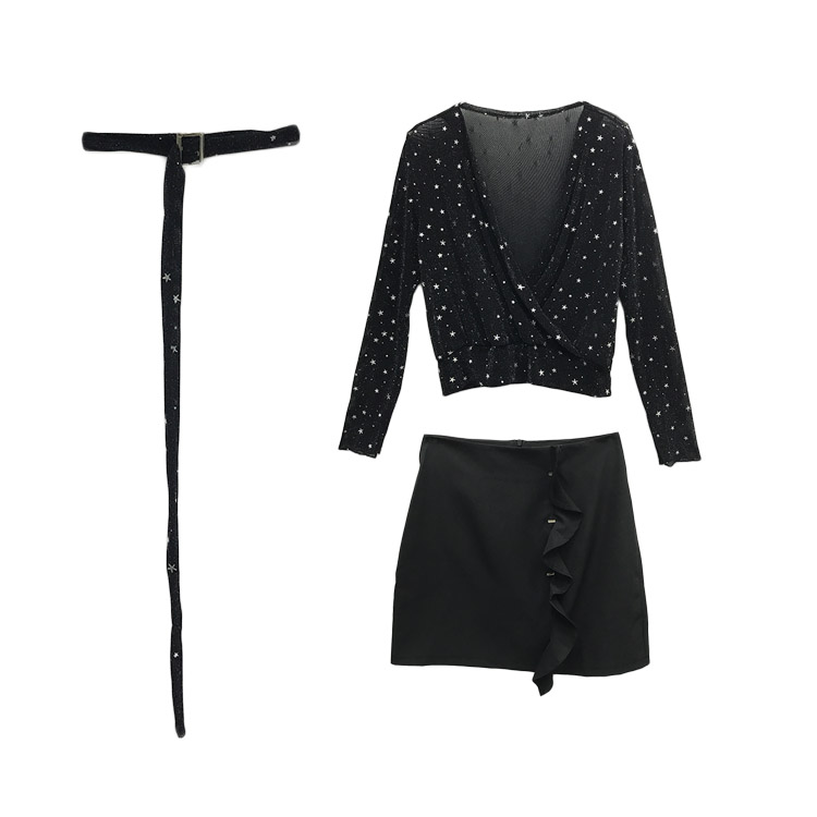 / 網紅同款套裝設計感星星V領長袖打底衫+脖圈+荷葉邊半身裙三件套