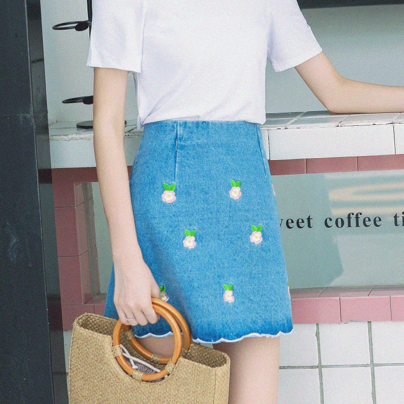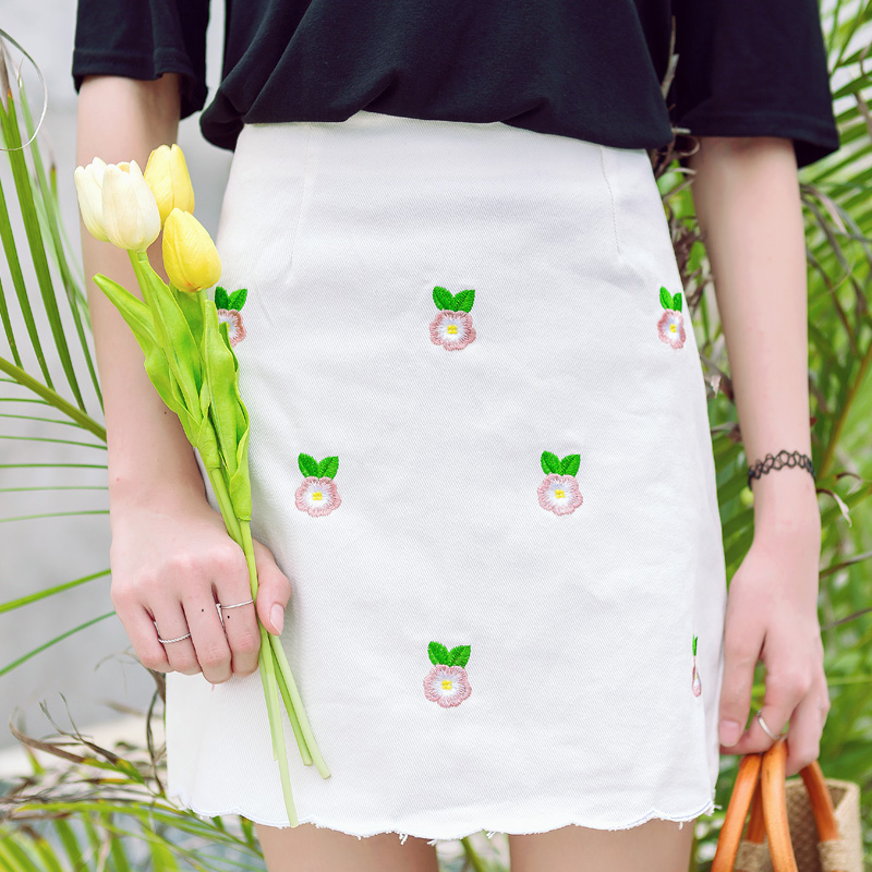 / 牛仔半身裙女夏裝新款女裝韓版百搭刺繡高腰修身白色毛邊短裙