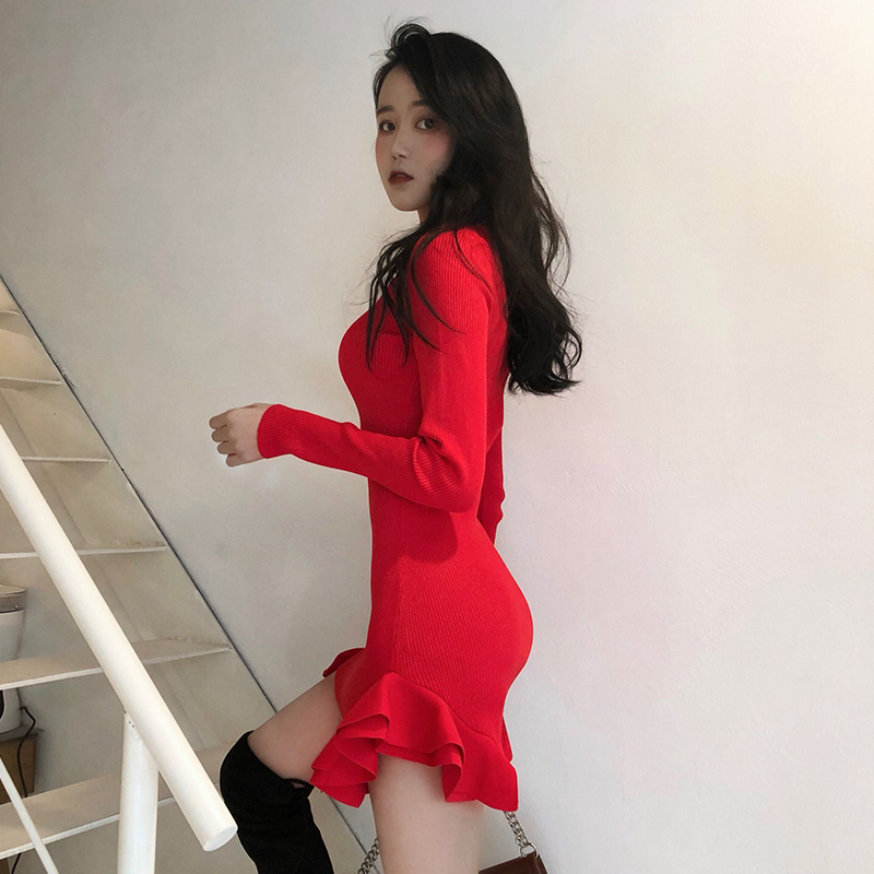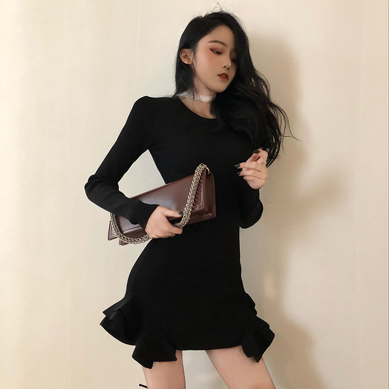 氣質荷葉魚尾裙女韓版修身顯瘦秋裝新款長袖針織連衣裙黑色短裙子