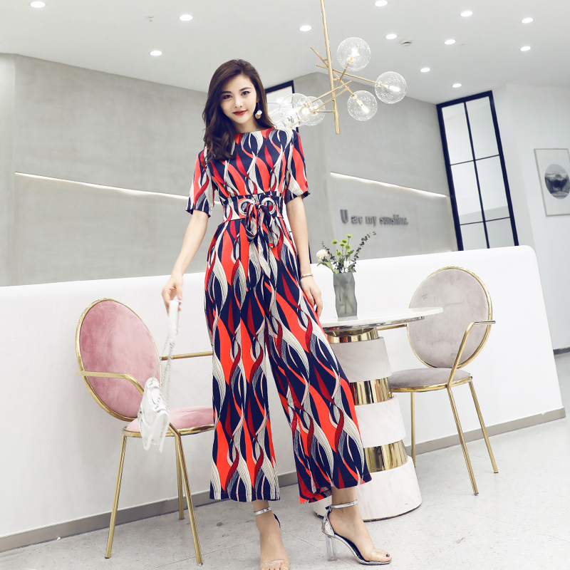 / 名媛氣質2018夏季新款印花短袖九分闊腿收腰顯瘦網紅溫柔連體褲女