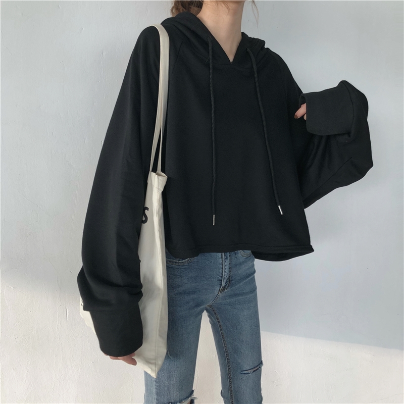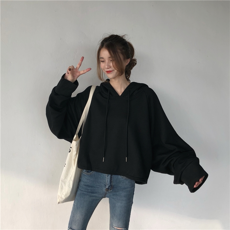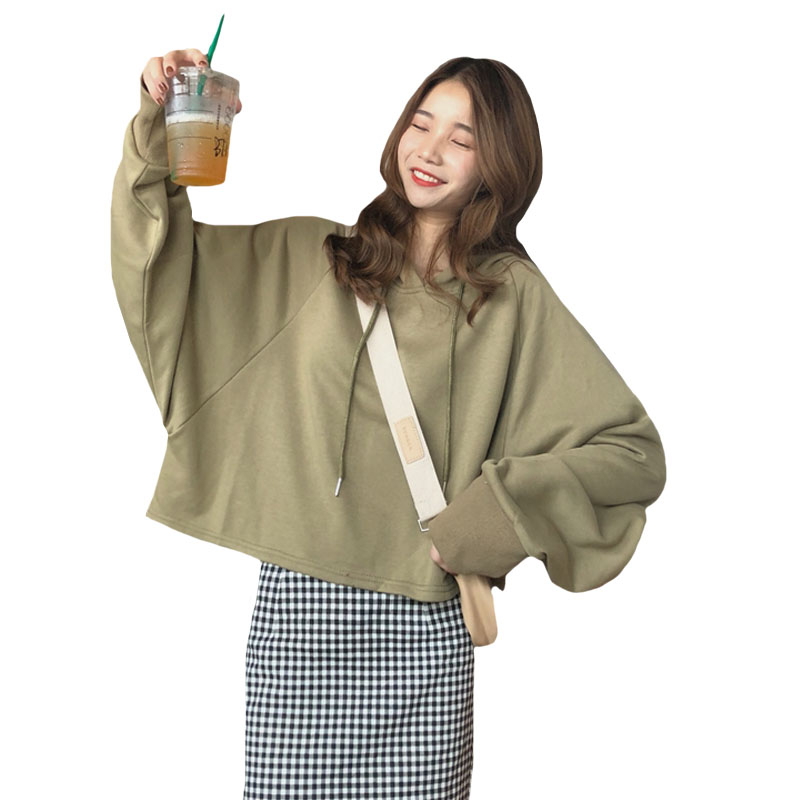 / 秋季女裝韓版短款簡約蝙蝠袖套頭連帽衛衣寬松純色長袖上衣外套潮