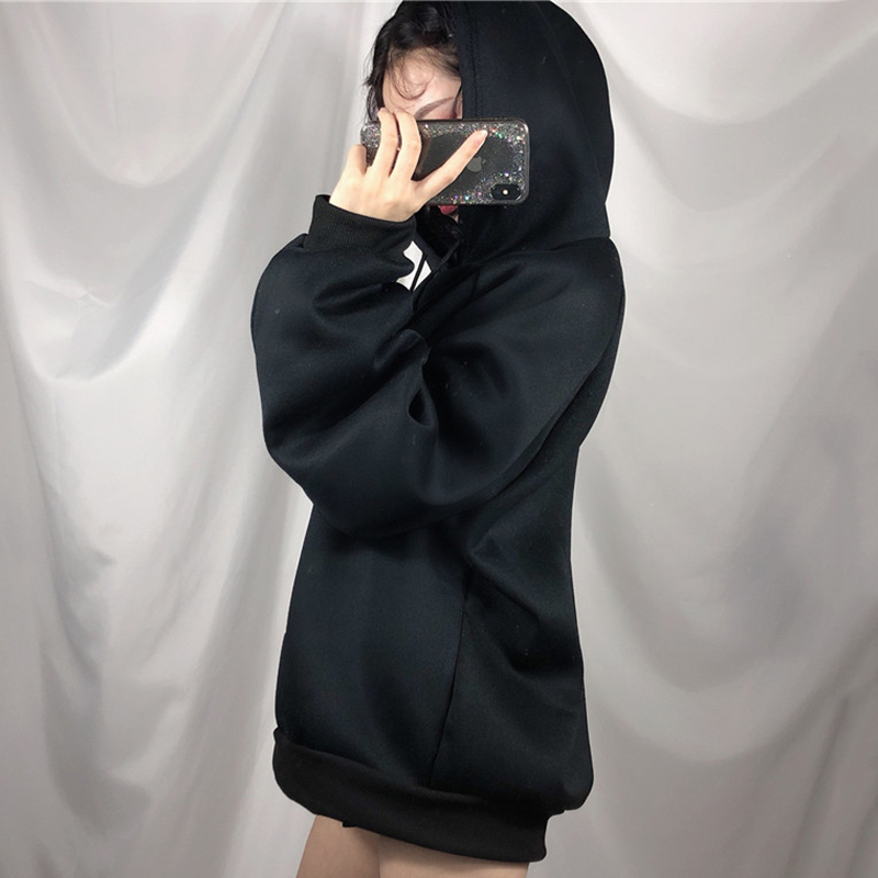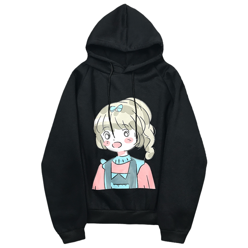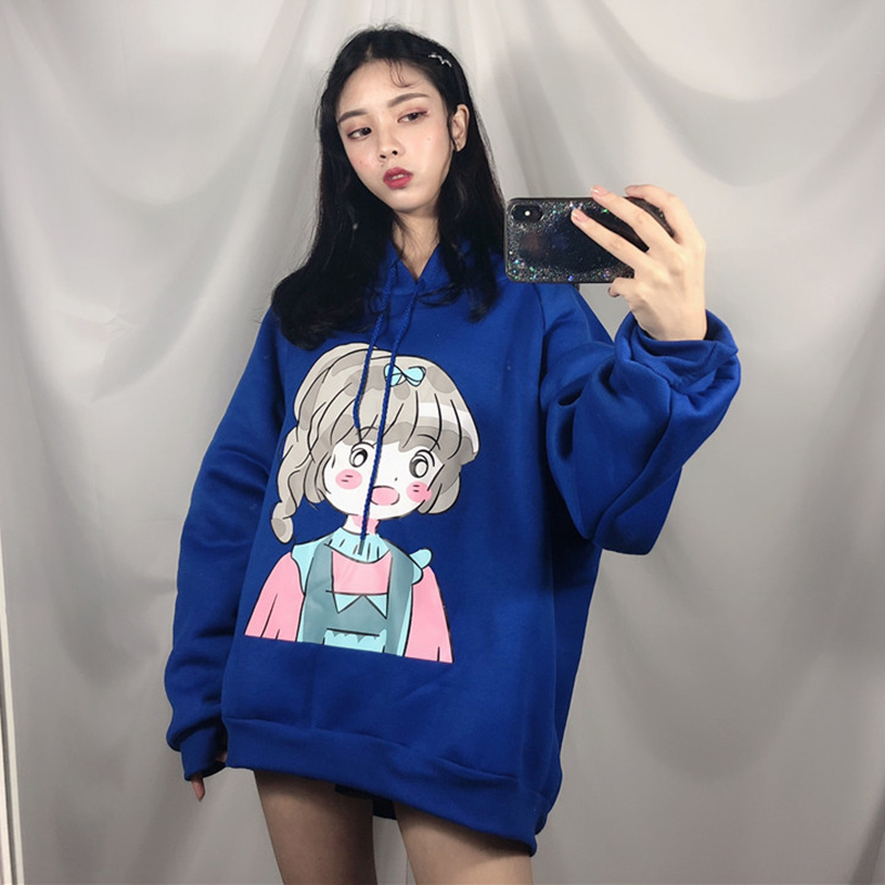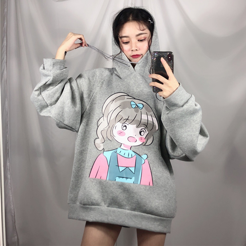 / 卡通印花加絨外套秋裝女新款學生慵懶風連帽衛衣寬松插肩長袖上衣