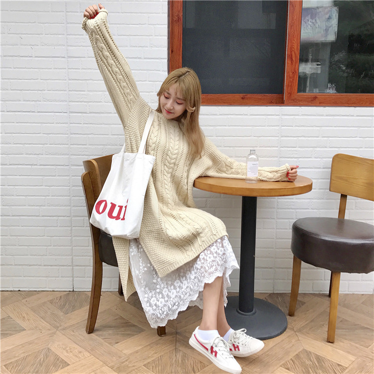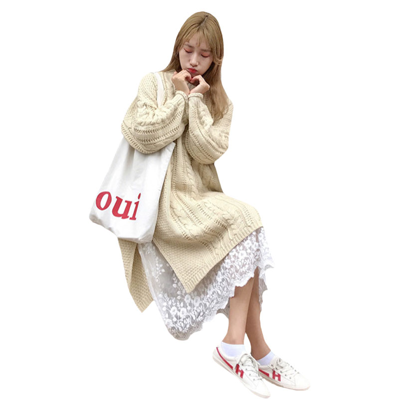 韓版時尚休閑套裝秋季慵懶風開叉毛衣連衣裙+蕾絲背心裙兩件套女
