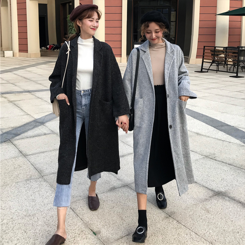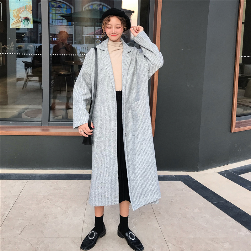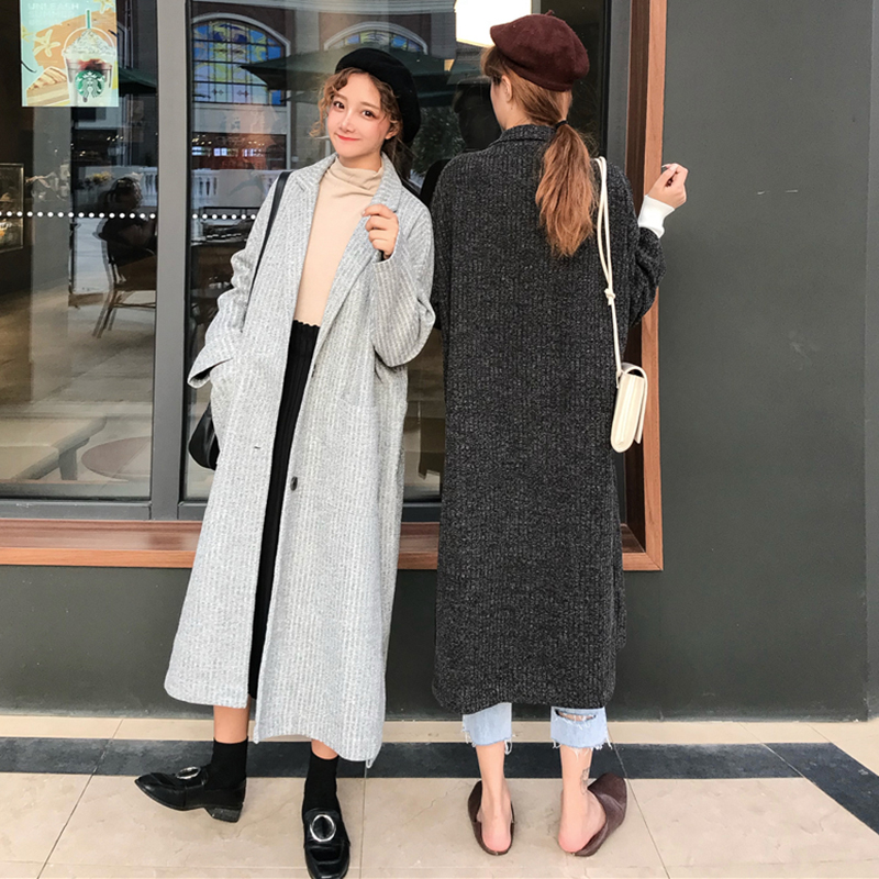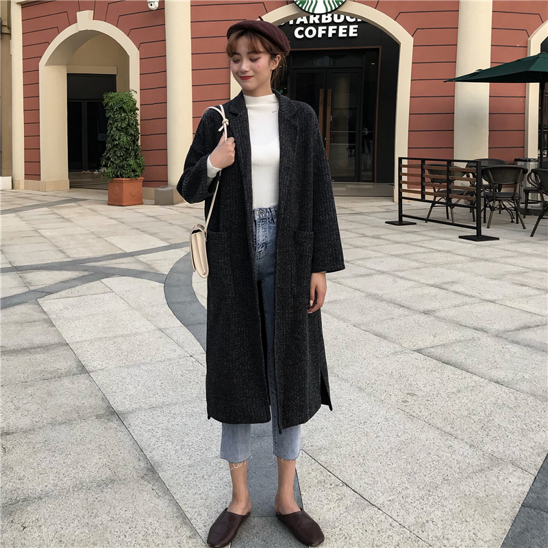 / 開叉復古翻領中長款外套女秋裝新款純色慵懶休閑開衫寬松長袖大衣