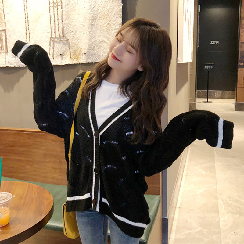 / 慵懶風毛衣女秋裝新款韓版鏤空針織開衫外套學生黑色寬松長袖上衣